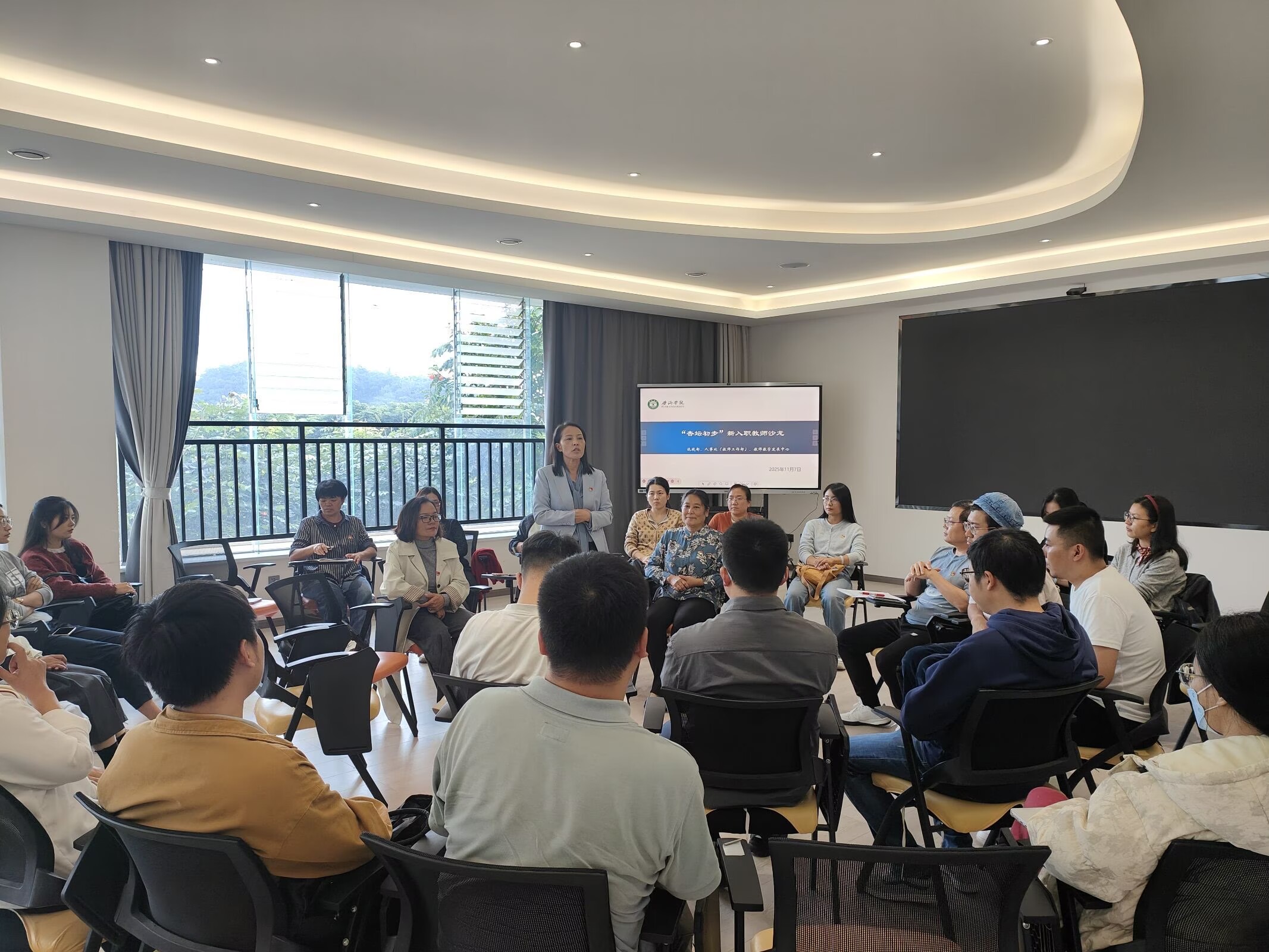 为深入学习贯彻习近平总书记关于教育的重要论述,贯彻落实全国教育大会和党的二十届四中全会精神,帮助新入职教师更好地适应教育教学工作岗位,学校于11月7日在心理健康中心团体辅导室举行新入职教师“杏坛初步”沙龙。